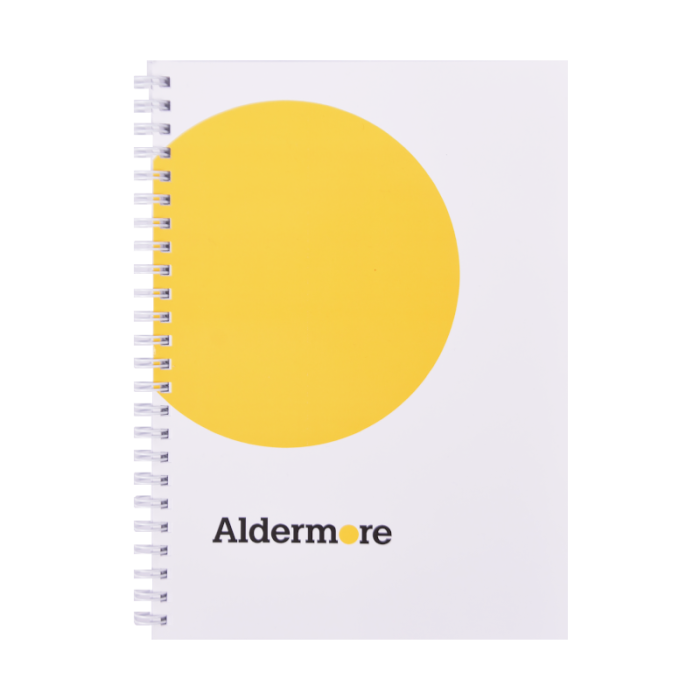 A5 card cover wiro notebook with 75 sheets/ 150 lined pages and flyleaf insert page. 300gsm card cover and 80gsm paper. Printed full colour Aldermore logo to the front cover and Banking for the bold to the back to cover